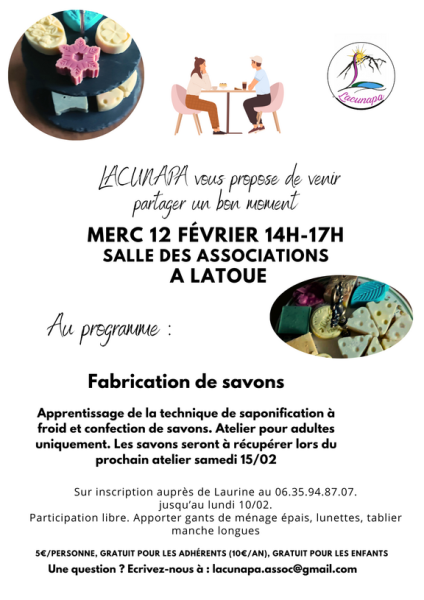 Apprentissage de la technique de saponification à froid et confection de savons. Atelier pour adultes uniquement. Les savons seront à récupérer lors du prochain atelier samedi 15/02