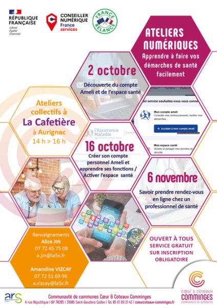 Inscriptions : Alice 07 72 45 75 08 Dans le cadre du Contrat Local de Santé, organisé par France Service du Centre intercommunal d'action social et le service santé de la Communauté de Communes Coeurs & Coteaux de Comminges, La Cafetière accueille une série d'ateliers numériques en santé, animés par Alice et Amandine, conseillères numériques.