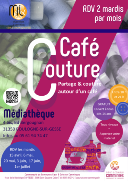 Rejoignez-nous au Café couture de la médiathèque les mardis 15 avril, 6 mai, 20 mai, 3 juin, 17 juin et 1er juillet.