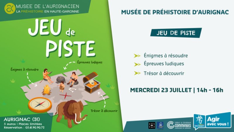 Jeu de Piste au musée de Préhistoire d'Aurignac Pour célébrer les vacances, le Musée de l'Aurignacien propose un jeu de piste sur le sentier de l'abri préhistorique. Jeu de Piste au musée de Préhistoire d'Aurignac Pour célébrer les vacances, le Musée de l'Aurignacien propose un jeu de piste sur le sentier de l'abri préhistorique. SYNOPSIS La nouvelle exposition "Un temps de mammouth" est ouverte au public depuis le vendredi 18 avril. Mais lors du montage, une dent qui devait être exposée a été perdue ! Aidez-nous à la retrouver en résolvant les énigmes. La vigilance sera de mise car les participants auront pour mission de collecter tous les indices sur le sentier pour résoudre l'enquête, retrouver l'objet perdu et remporter une récompense ! Au programme de ce tout nouveau scénario : Énigmes à résoudre : Mettez vos méninges à l'épreuve. Épreuves ludiques : Des défis pour tous les âges. Trésor à découvrir : Une récompense à la clef. N'oubliez pas d'apporter votre esprit d'équipe, un bon sens de l'orientation et surtout, votre bonne humeur ! Cette animation de 2h est destinée à tous les âges et à un public familial. Le départ du jeu de piste peut se faire entre 14h et 16h. Deux niveaux de difficulté sont possibles : Parcours niveau 1 : Enigmes sur 3 km Parcours niveau 2 : Enigmes sur 3,5 km (à partir de 7 ans) Source : https://www.musee-aurignacien.com/fr