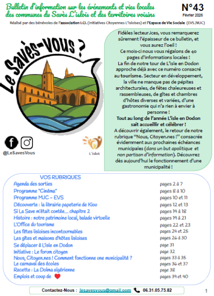 La fin de notre tour de L’isle en Dodon approche déjà avec ce numéro consacré au tourisme. Secteur en développement, la ville ne manque pas de pépites architecturales, de fêtes chaleureuses et rassembleuses, de gîtes et chambres d'hôtes diverses et variées, d’une gastronomie qui n’a rien à envier à personne !