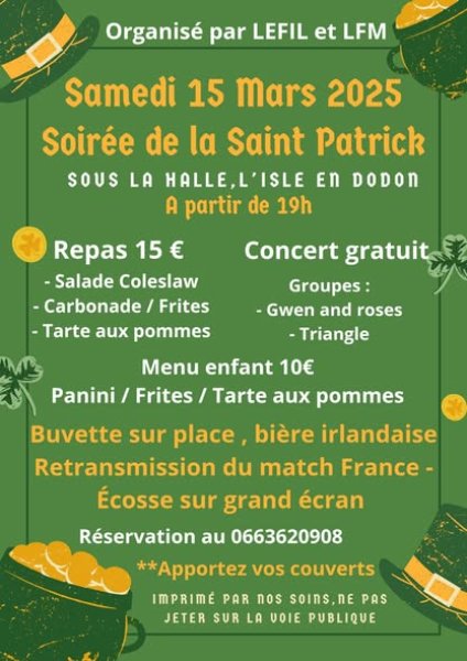 🍀 L'isle en dodon fête la saint patrick 🍀 et pour cela les associations Le Fil comité des fêtes et LFM vous proposent une super soirée le samedi 15 mars .